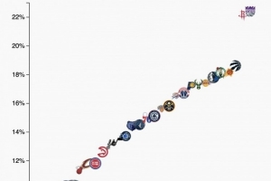 本賽季各球隊中投(10英尺-三分線之間)占比如圖所示,擁有德羅贊的國王和杜蘭特的火箭占比超過22%,聯盟獨一檔,公牛則不到7%聯盟最低,也算獨一檔。