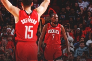 賽后火箭官方發布贏球海報,杜蘭特和謝潑德(背影)成為封面人物。