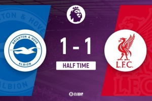 傷停補(bǔ)時(shí)5分鐘。上半場(chǎng)比賽結(jié)束,布萊頓1-1利物浦。