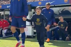 體育資訊3月22日訊 西甲第29輪比賽,巴薩在諾坎普迎戰(zhàn)巴列卡諾。本場(chǎng)比賽之前,巴薩球員手牽唐氏綜合癥球童走進(jìn)球場(chǎng),表達(dá)了對(duì)他們的關(guān)愛。