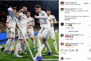皇馬后衛(wèi)卡瓦哈爾社媒曬照慶祝勝利,配文:“韌性、團隊精神與對這枚隊徽的敬意。”