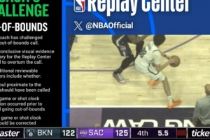 特拉奧雷被兩位裁判同時吹踩線和進攻犯規(guī),籃網(wǎng)挑戰(zhàn)失敗,裁判回放后明顯踩線,還是國王球權(quán)