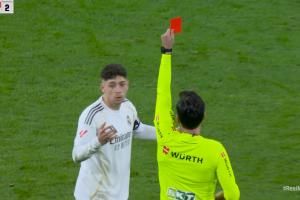 體育資訊03月23日訊 西甲第29輪馬德里德比,皇馬3-2逆轉馬競。比賽中皇馬中場巴爾韋德背后踢倒巴埃納吃到直紅。