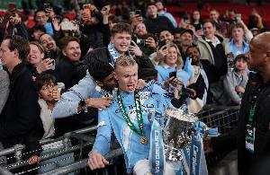體育資訊3月24日訊 曼城2-0戰(zhàn)勝阿森納奪得聯(lián)賽杯冠軍,哈蘭德賽后慘遭一男球迷強(qiáng)吻。