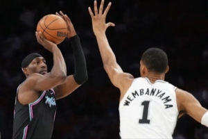 希羅沒法給阿德巴約了,只好找扣籃位的維金斯,但文班亞馬飛身殺回,維金斯高拋,被文班蓋掉。