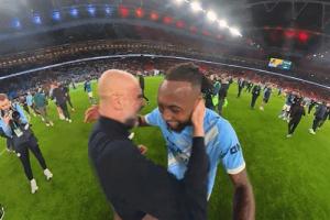 曼城官方曬視頻,賽后曼城主帥瓜迪奧拉與塞梅尼奧擁抱,連拍塞梅尼奧胸口9下并說謝謝。