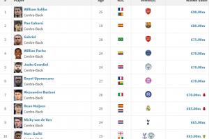 最新全球中后衛身價排名(單位:歐元)↓