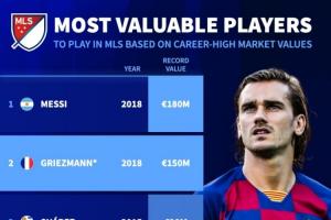 據(jù)德轉(zhuǎn)統(tǒng)計,格列茲曼成為巔峰身價第二高的美職聯(lián)球星,他的巔峰身價是2018年時的1.5億歐,僅次于梅西的1.8億歐。
