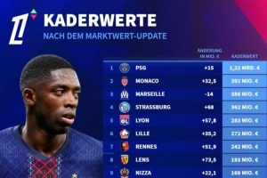 體育資訊3月28日訊 德國轉(zhuǎn)會市場更新了法甲球員的身價,并列出法甲球隊身價排名,巴黎12.2億歐斷層居首,摩納哥3.92億歐次席。