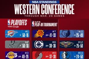 3.截至今日賽后,東西部前十排名如下: