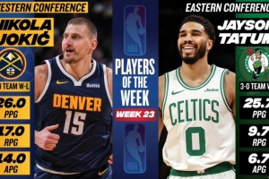 體育資訊3月31日訊 今天,NBA官方公布了25-26賽季第23周東西部周最佳球員,塔圖姆和約基奇當選。