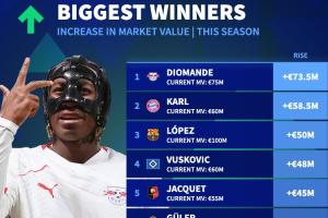 1-揚(yáng)·迪奧曼德(RB萊比錫),+7350萬(wàn)歐,現(xiàn)身價(jià)7500萬(wàn)歐;