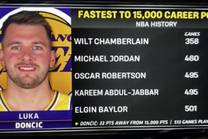 現(xiàn)場(chǎng)給出統(tǒng)計(jì),東契奇距離15000分只差33分,今天是他生涯的第513場(chǎng)比賽。