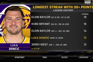 貝勒18場、科比16場、貝勒14場、東契奇12場、韋斯特12場。