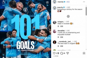 體育資訊3月10日訊 本賽季到目前為止,曼城各項賽事總計踢了45場比賽,已經打進101粒進球,俱樂部官方也曬出海報,慶祝本賽季進球破百。