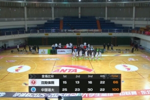 末節比賽,沈陽體院的表現沒有絲毫起色,前兩分半的時間里中國海大再打一波10-2的攻勢,分差直接突破四十分,比賽徹底失去懸念,最終中國海大100-66大勝沈陽體院。