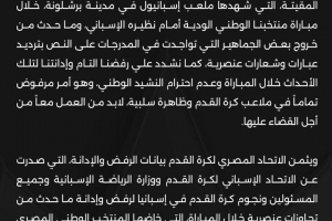 此役西班牙球迷在場上呼喊種族歧視口號,對此埃及足協發布聲明:“埃及足球協會強烈譴責在巴塞羅那西班牙人球場進行的埃及國家隊與西班牙國家隊友誼賽中發生的令人發指的種族主義事件,部分現場觀眾高喊種族主義口號,這種行為我們予以完全拒絕和嚴厲譴責。此外,對于比賽中出現的不尊重埃及國歌的行為,我們同樣表示堅決反對,此類行為在足球場上是絕對不可接受的,是一種必須攜手根除的負面現象。