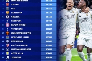 以下為足壇俱樂部身價(jià)榜top10: