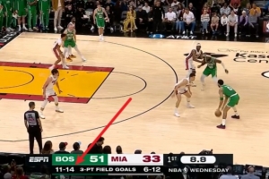 第一節,凱爾特人外線箭如雨下,單節全隊三分15投11中,命中率高達73.3%,單節凈勝熱火20分。