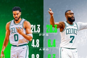 期間,杰倫·布朗場均數據28.3分6.3籃板6.4助攻,投籃命中率45.5%,三分32.2%。