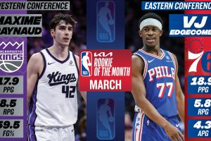 體育資訊04月03日訊 今天NBA官方公布了3月份月最佳新秀,西部國(guó)王42號(hào)秀雷諾和東部76人探花秀埃奇庫(kù)姆當(dāng)選。