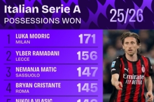 體育資訊4月3日訊 足球數據網站Squawka統計本賽季至今意甲球員奪回球權排行榜,40歲莫德里奇171次第一,馬蒂奇第三。