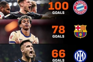 體育資訊4月5日訊 拜仁在本輪德甲讓二追三,3-2逆轉絕殺弗賴堡,本賽季28輪德甲已狂轟100球,同期領跑五大聯賽。