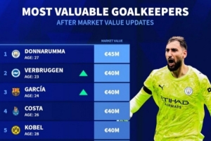 體育資訊4月5日訊 轉(zhuǎn)會(huì)市場(chǎng)網(wǎng)更新了門將身價(jià)排行榜,目前曼城門將多納魯馬身價(jià)4500萬歐元最高,在他身后是布萊頓門將維爾布魯根,身價(jià)4000萬歐元。