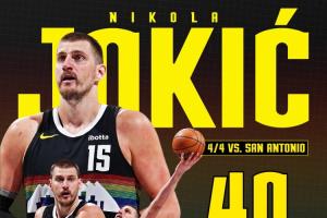 此役,掘金巨星約基奇出場43分59秒25投13中,三分5中1、罰球15中13,砍下40分8籃板13助攻3蓋帽,沒有失誤。
