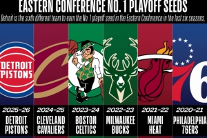 值得一提的是,在過(guò)去的六個(gè)賽季中,東部第一分別由六支不同的球隊(duì)輪流坐,分別是76人、熱火、雄鹿、凱爾特人、騎士、活塞。