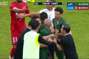 比賽第88分鐘,浙江外援米特里策用手拉李鎮全頭發,主裁查看VAR后直紅將米特里策罰下。米特里策非常憤怒,還想要沖上前去,隊友趕緊把他拉住。
