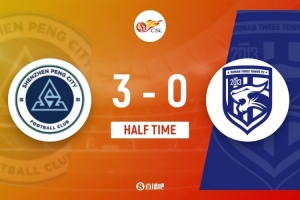 傷停補時4分鐘。上半場比賽結束,深圳新鵬城3-0武漢三鎮。