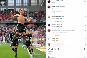 卡爾也在賽后通過社媒曬出自己進(jìn)球后的脫衣慶祝照,并配文:“重大的勝利????42”。