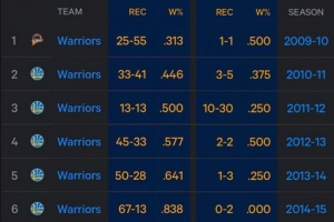 庫里缺席時(shí)勇士戰(zhàn)績9-16,勝率36.0%
