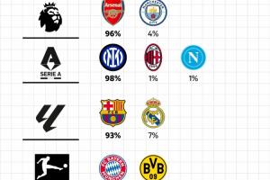 體育資訊04月06日訊 歐洲五大聯賽已經接近賽季尾聲,數據網站Football Rankings根據聯賽分數、近期狀態、剩余賽程等因素,列出了各聯賽球隊奪冠概率,五大聯賽領頭羊奪冠概率都超過了90%。