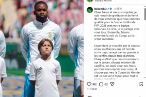 巴坎布社媒曬出自己在國(guó)家隊(duì)的照片,并寫(xiě)道:“親愛(ài)的剛果兄弟姐妹們,我懷著無(wú)比的感激與自豪向大家宣布——我們的國(guó)家隊(duì)已成功晉級(jí)2026年世界杯!這個(gè)夢(mèng)想,我與你們所有人共同分享。讓我們攜手在世界舞臺(tái)上發(fā)出剛果的聲音。”