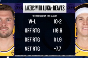 本賽季詹姆斯缺席而東契奇、里夫斯出戰(zhàn)時(shí),湖人10勝2負(fù)