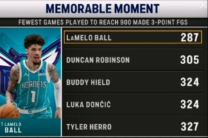 轉播方曬出一組數據,NBA歷史上投進生涯前900記三分所用場數最少的球員榜單如下:
