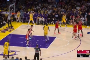 GIF-東契奇鉆人縫直接拋投命中,但是不算,先犯規給兩罰;雷迪克攤手,老詹不停的給裁判抱怨