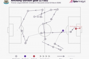 數(shù)據(jù)統(tǒng)計顯示,戈登的這粒進(jìn)球,紐卡斯?fàn)?1名球員中有10人參與其中,沃爾特馬德是在此期間唯一沒有觸球的球員。