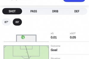 數據網站Sofascore曬出居萊爾射門路線圖,并調侃道:“我們可能需要重新設計球員的射門路線圖了,因為半場圖已經放不下這腳吊射了。”