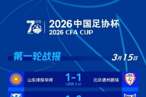 體育資訊3月15日訊 2026年足協(xié)杯第一輪第三個(gè)比賽日結(jié)束,北京通州鵬瑞、寧夏平羅恒利、武漢聯(lián)鎮(zhèn)、聊城傳奇綠業(yè)春、泉州青工走走紡織五支球隊(duì)晉級。