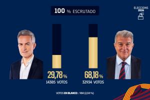 體育資訊3月16日訊 每體報道,拉波爾塔在巴塞羅那俱樂部主席選舉中再次大獲全勝,獲得32934票,占總票數的68.18%。維克托·豐特以14385票(29.78%)位居第二。