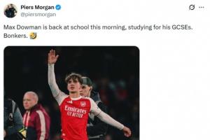 體育資訊03月16日訊 今天是周一,英國名嘴、著名阿森納球迷皮爾斯·摩根社媒發帖,調侃阿森納16歲小將道曼今天還要去上學。