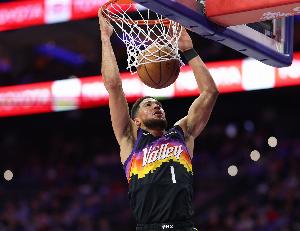 布克第三節手感火熱,單節8中6砍下16分,本場已經19中13得到35分3籃板5助攻。