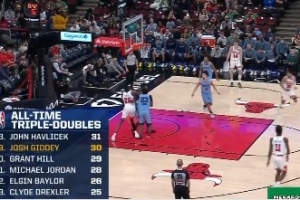 公牛球員吉迪已經(jīng)拿到13分10籃板10助攻的三雙數(shù)據(jù),這是他生涯第30個(gè)三雙,他超越格蘭特·希爾,獨(dú)占三雙歷史總榜第十九位。