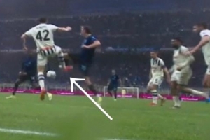 VAR裁判室: “讓我看之前那個角度:這里他踢到了球,國米球員也碰到了。動作很輕。讓我看動態回放:他的腿是彎曲的……檢查完畢,動作很輕,雖然有接觸但非常輕微。觸碰極小,并不是踢了一腳。”